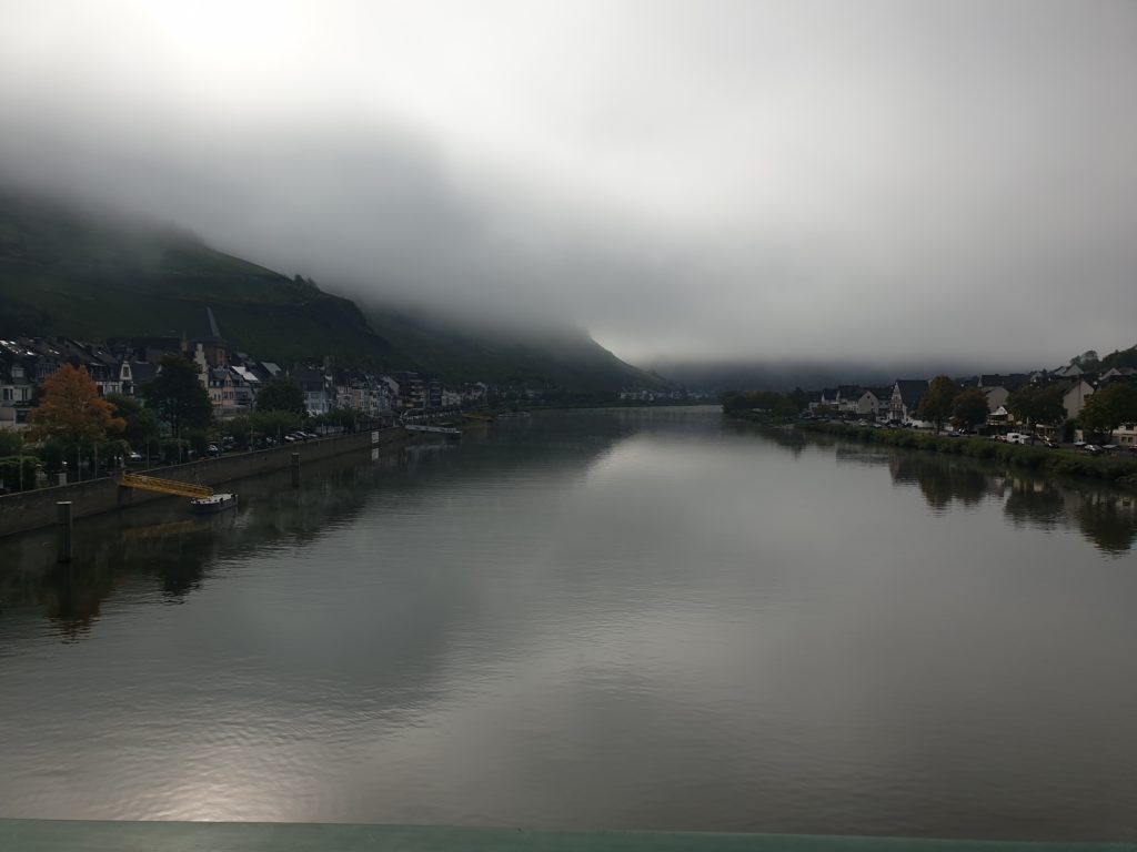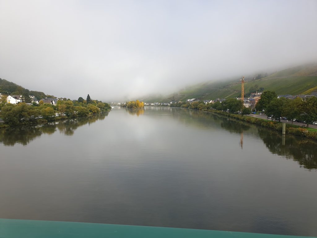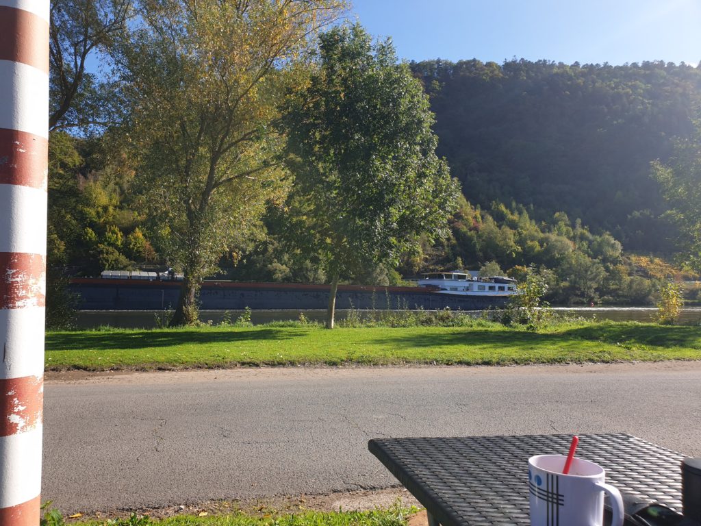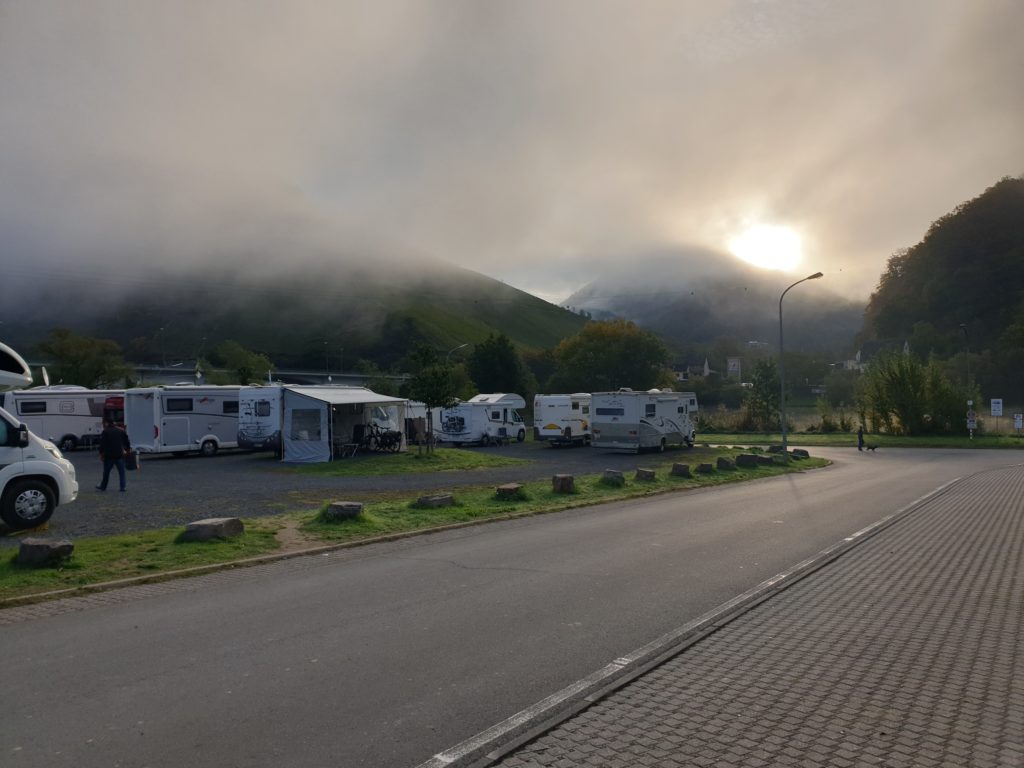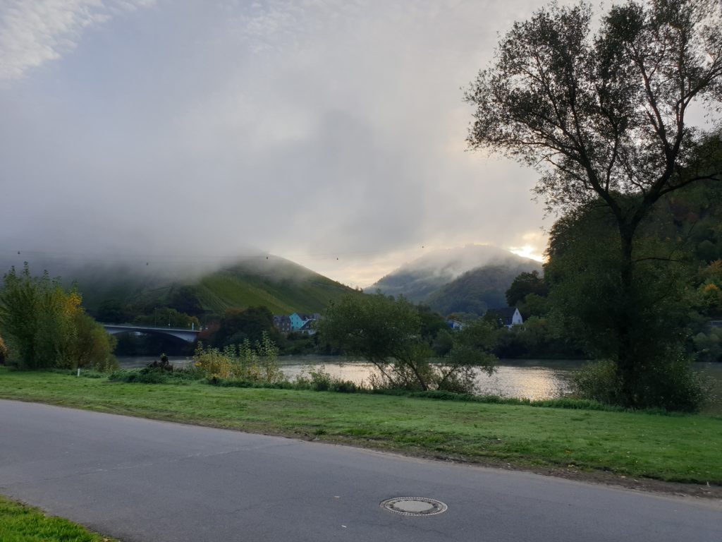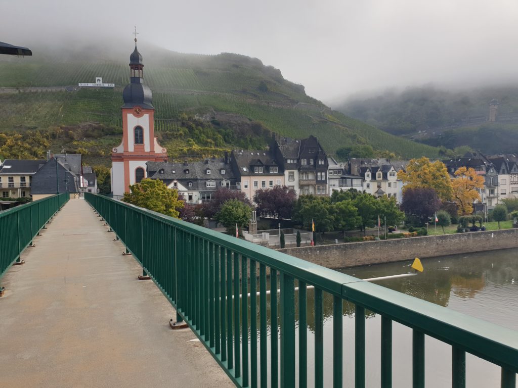 Am Freitag stehen wir mit Nebel auf, der Brötchenservice kommt pünktlich, der Tag wird gut. Wir machen den ersten Rundgang in Zell. Anschließend sitzen wir in der Sonne vor der Mosel. Die Nächte sind frisch, deshalb brauchen wir am Abend und morgens die Heizung.