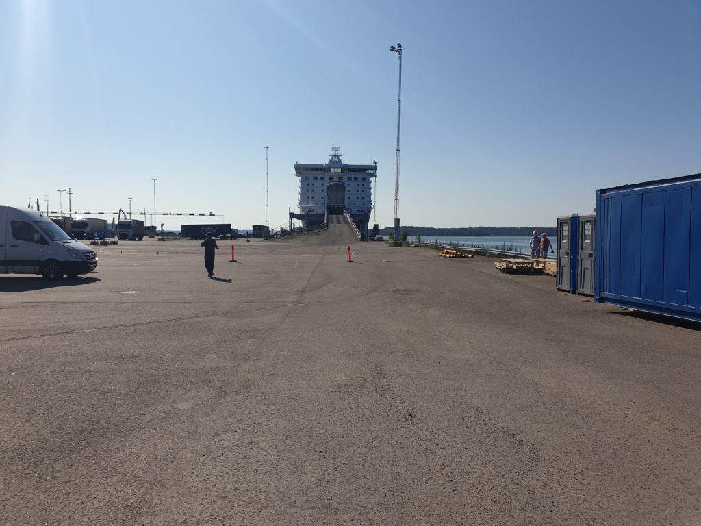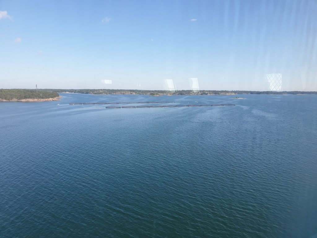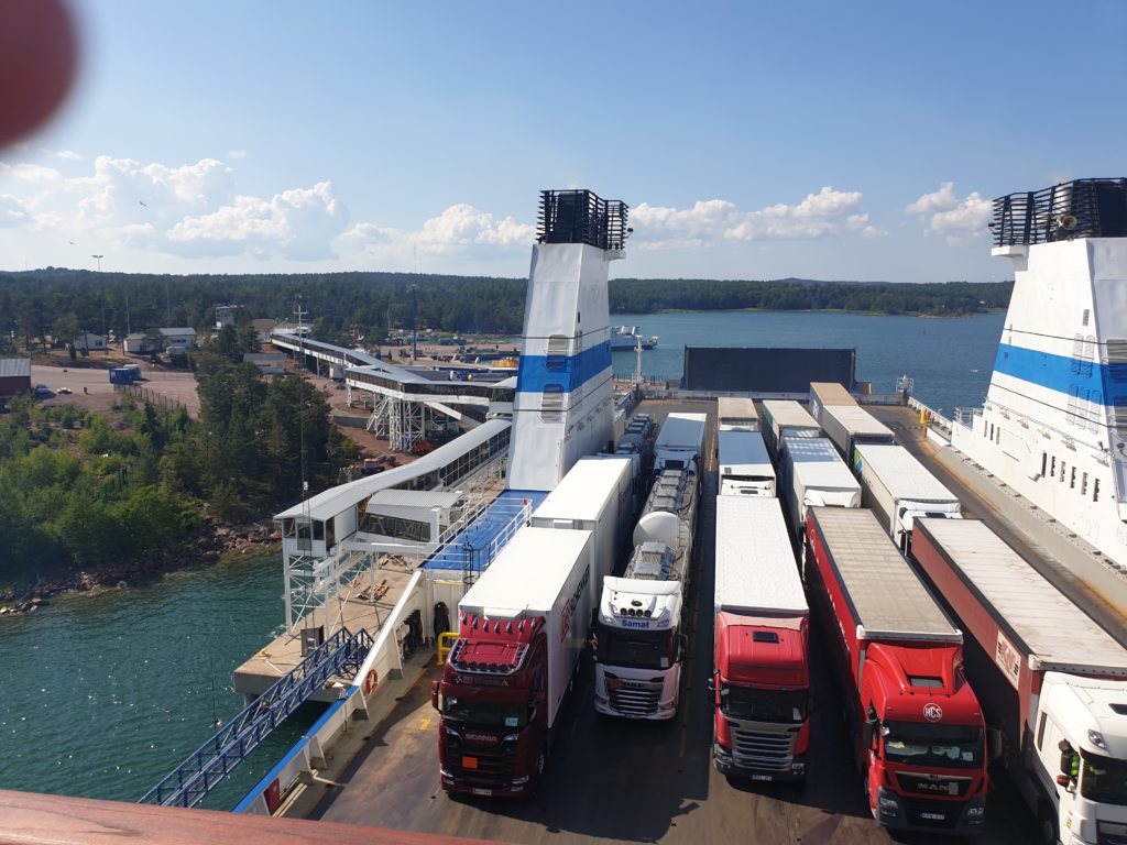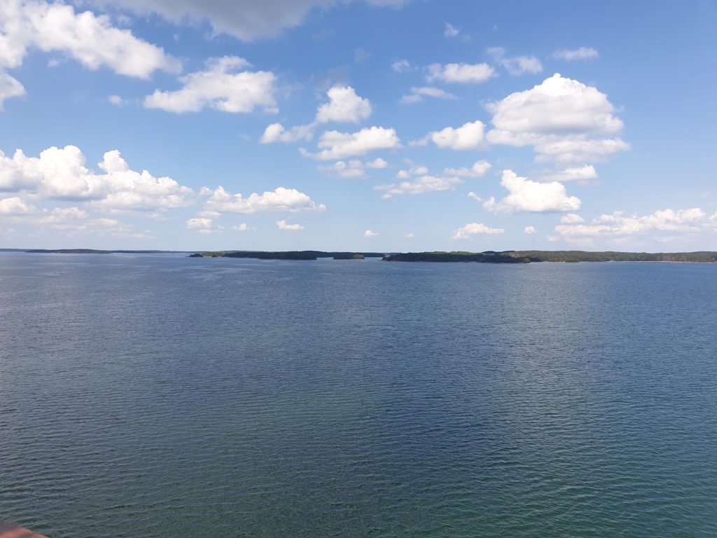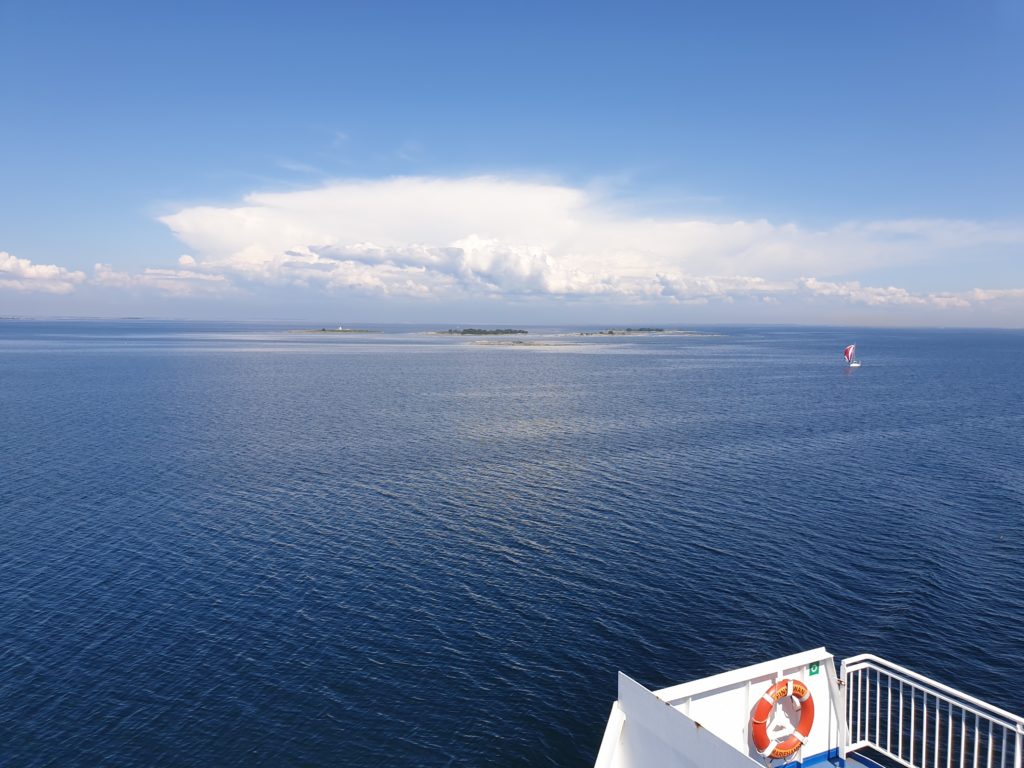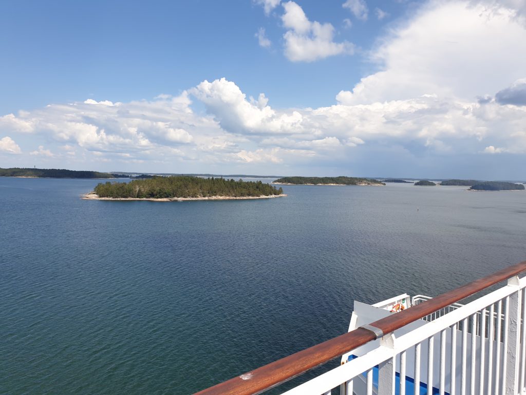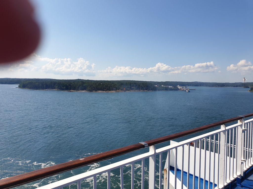 Wir müssen heute früh aufstehen, haben den Wecker gestellt. Die Sonne lacht. Wir fahren zeitig zum Fähranleger und stehen als Erster in der zweiten Reihe. Das Fährschiff legt pünktlich um 11:45 finnischer Zeit ab. Die Überfahrt nach Kapelskär dauert 8 Stunden, mit einem Zwischenhalt im Hafen von Längnas auf Fasta Äland. Die große Fähre muss im Zickzack Kurs durch die vielen Inseln und Felsen fahren. Der Preis mit knapp 175 € inklusiv 2 volle Mahlzeiten ist unschlagbar günstig.