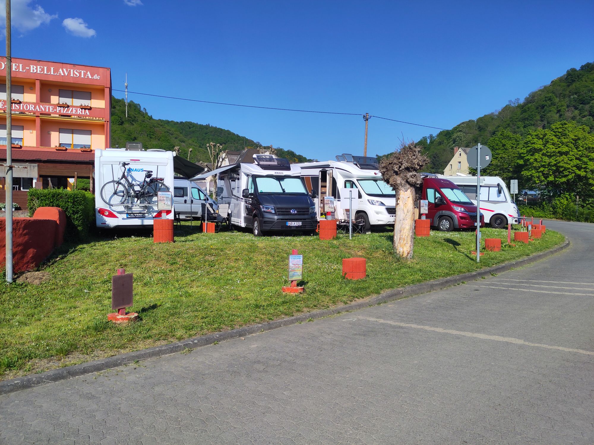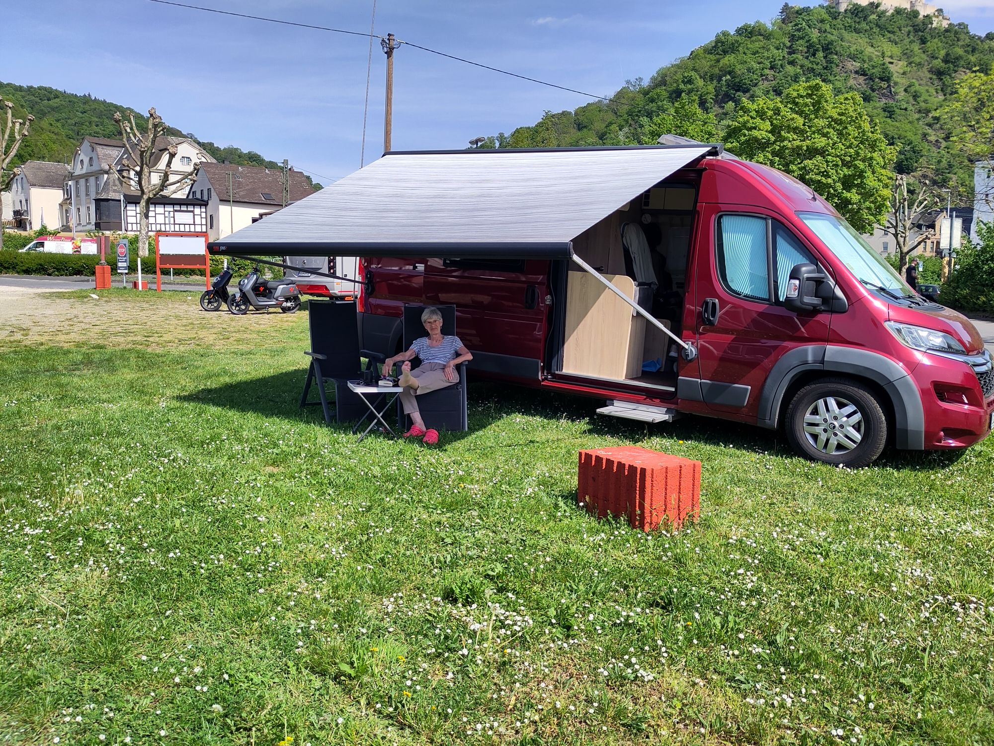 Wir sind heute endlich wieder gegen 11 Uhr losgefahren. Das Wetter lädt uns ein. Gegen 13 Uhr sind wir an unserem geplanten Stellplatz in Lahnstein. Leider ist der Platz schon voll. Also weiter Richtung Süden. Alle Plätze sind voll, letztendlich landen wir in Braubach auf dem Platz des Hotel Bellavista. Hier waren wir schon mal vor 3 Jahren.