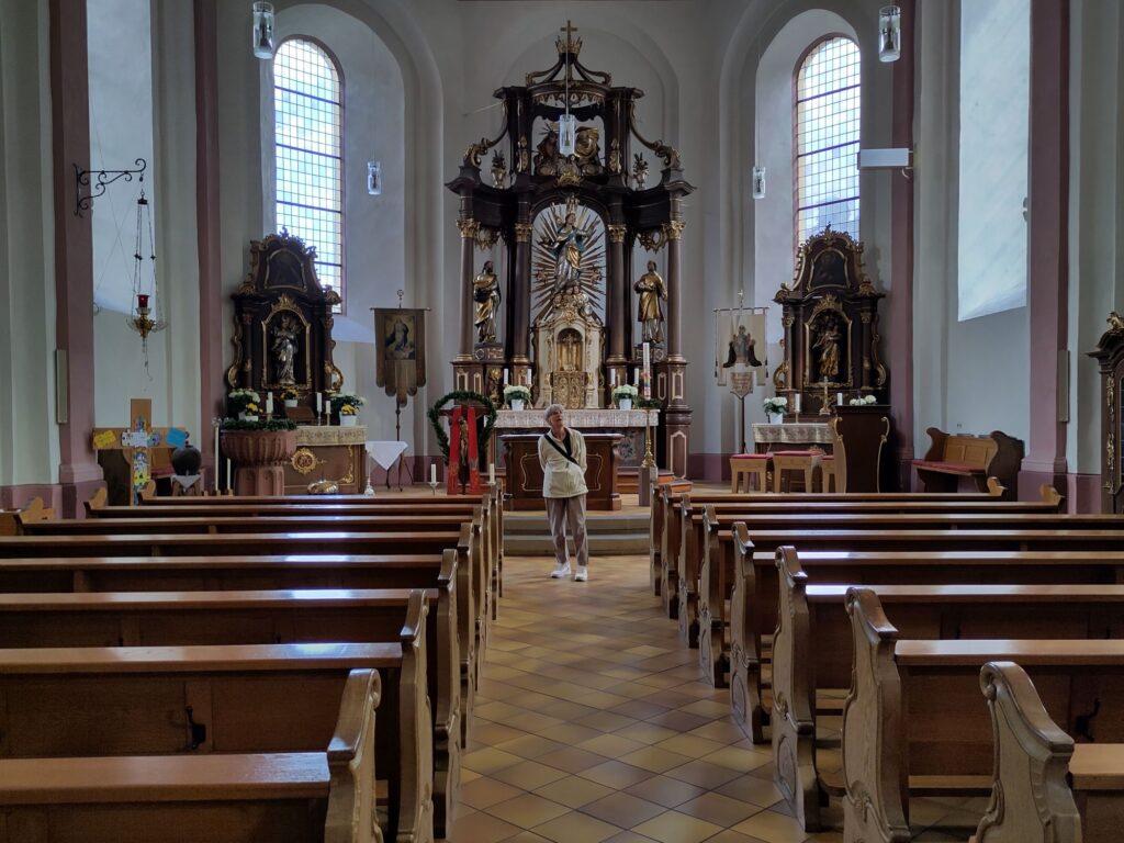 Nach einer kleinen Pause gehen wir zum Kiosk am Campingplatz, dort gibt es auch Kaffee und Kuchen. Danach laufen wir durch den kleinen Ort, und staunen über die Hochwassermarken. Wir gehen in die kleine Kirche.