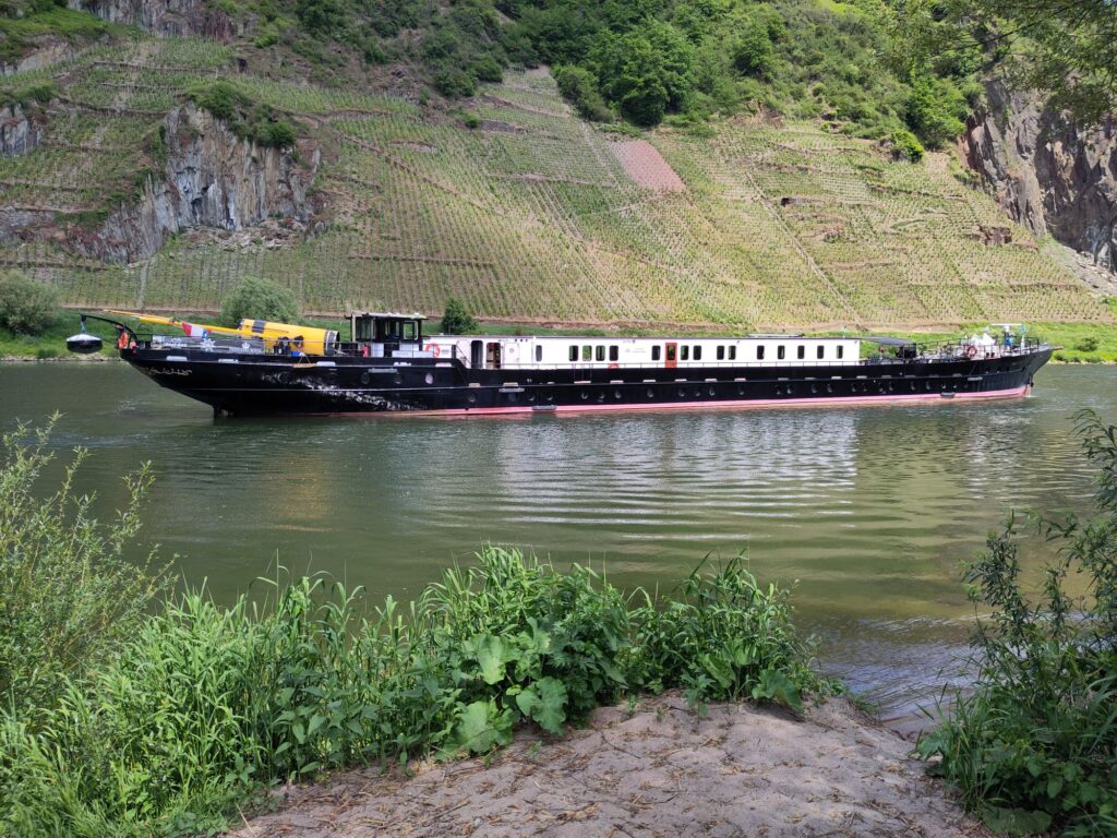 Wir machen heute einen ganz ruhigen Tag in der Sonne, der Wind frischt ab und an auf. Unter anderem schauen wir uns den Stau auf der Mosel an, irgendwo stockt es. Die Schiffe stehen auf der Stelle.