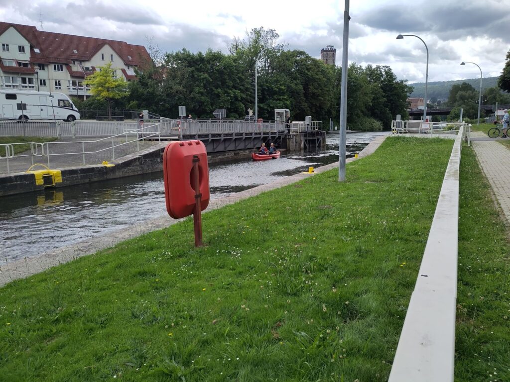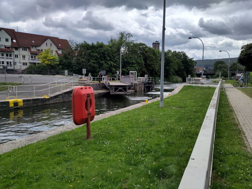 Hier ist eine kleine Schleuse nur für Sportboote. Die Drehbrücke ist nur 2,5 m breit und nur bis 3,5 t zugelassen. Für uns reicht es.