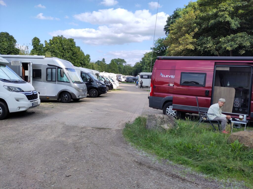 Am Sonntag fahren wir über die Landstraßen nach Celle. Dort kommen wir um 15 Uhr an. Hier ist es sehr warm und schwül mit 28° C. Wir stehen direkt am Französischen Garten und suchen den Schatten.